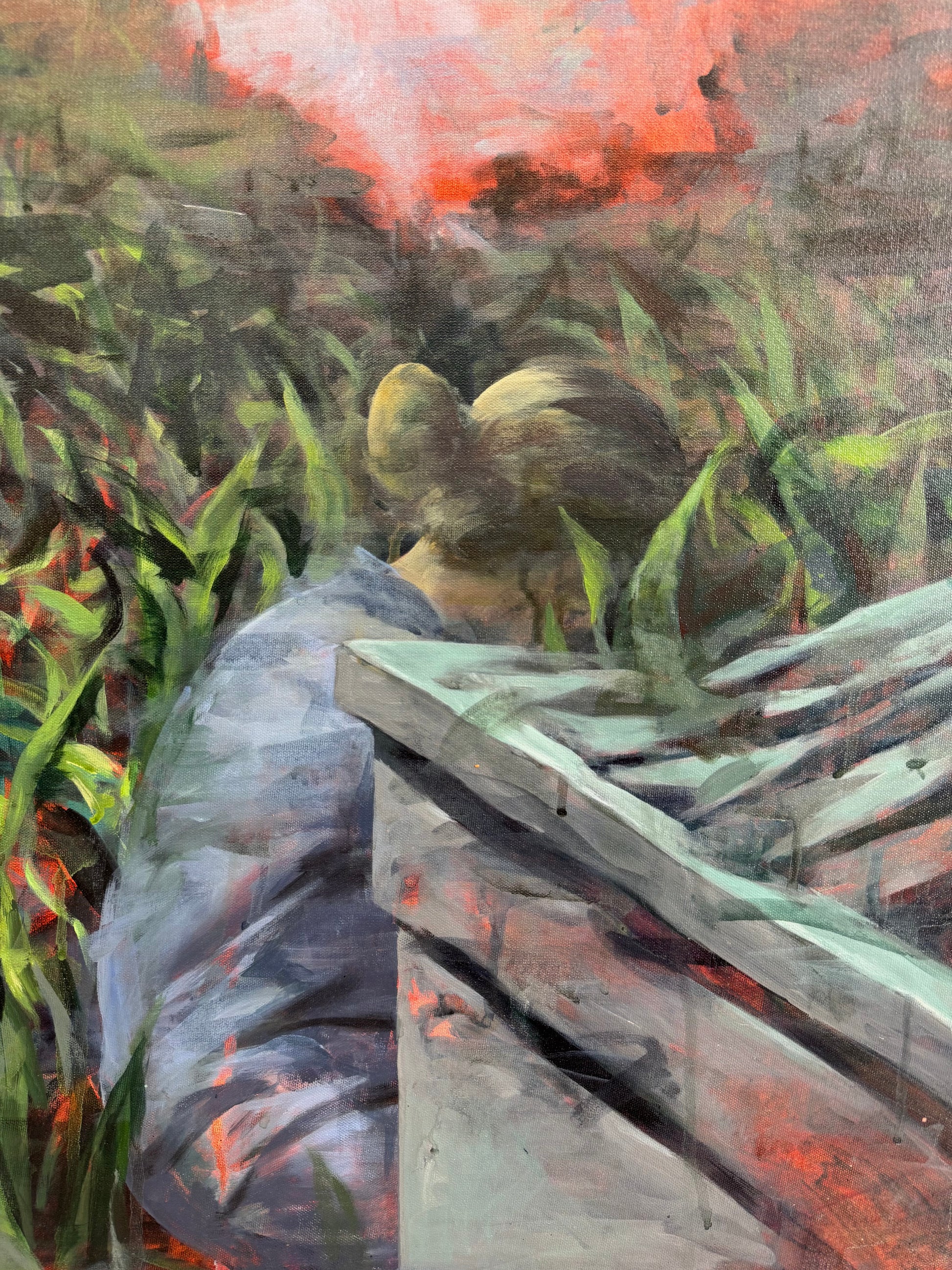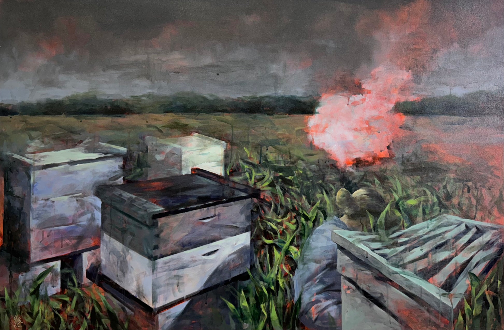 In 'Twilight,' a tranquil field scene unfolds beneath a thick sky, where abandoned hive boxes stand rooted in place, bearing the cool, gray light that touches upon their surfaces. The tension in the scene is palpable, depicted through the contrast of warm, rising smoke against the muted greens and violets of the enveloping grass. A solitary figure leans close to the hives, nearly blending into the surrounding vegetation, heightening a feeling of suspended care and uncertainty.